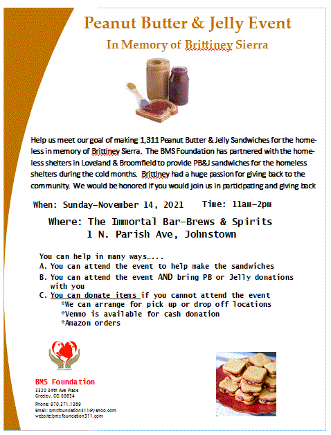Peanut Butter and Jelly Event with Project connect. Brittiney had a passion for giving to the community she lived especially during one of her most favorite time of the year (December). We successfully made 1,311 PB&J sandwiches and 126 tortilla PB&J to give to the homeless. We delivered to the Denver, Boulder and Larimer areas. HUGE thank you to all who donated and the Rio for donating the space!!